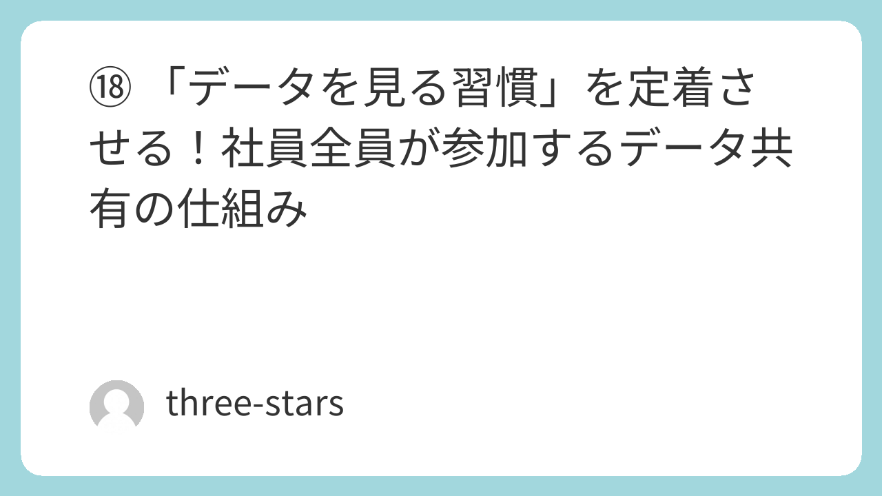 - 表彰例: 「今月のデータヒーロー」として、「Excelの新しい機能を使って集計作業を半減させた人」や「データ分析に基づき、顧客層別のメールマガジンを配信し、CVRを向上させた人」を表彰する。