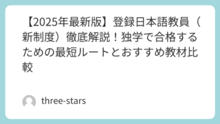 登録日本語教員 【2025年最新版】登録日本語教員(新制度)徹底解説!独学で合格するための最短ルートとおすすめ教材比較 導入:日本語教員「国家資格化」で何が変わる?2024年4月、「日本語教育の適正かつ確実な実施を図るための法律」の施行に伴い、日本語教員は「登録日本語教員」という国家資格になりました。これにより、日本語教員を目指す方にとっての学習ルートや、必... 2025.12.15 登録日本語教員